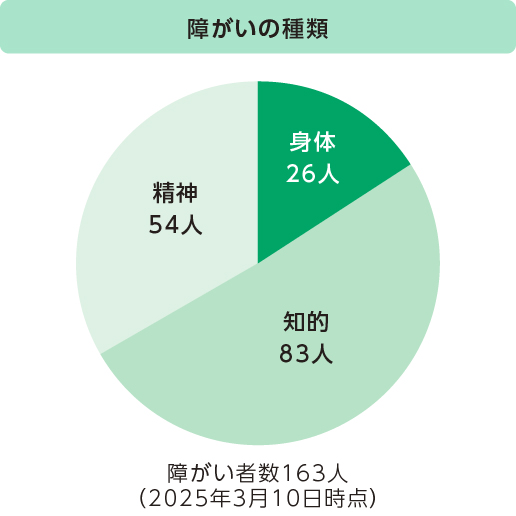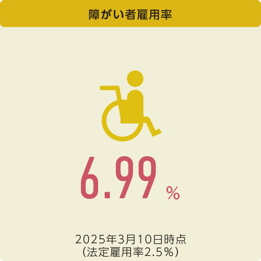 特別支援学校や支援機関、ハローワークなどさまざまな機関と連携を取りながら、企業実習の受け入れや障害者トライアル雇用制度を利用しての入社の推進など、障がい者雇用を積極的に進めています。2024年度は新たに11人が入社し、2025年3月現在で163人の方が活躍されています。雇用率は6.99% となり、障がい者雇用の取り組みを通じて誰もが働きやすく、能力を最大限に発揮できる職場を目指しています。