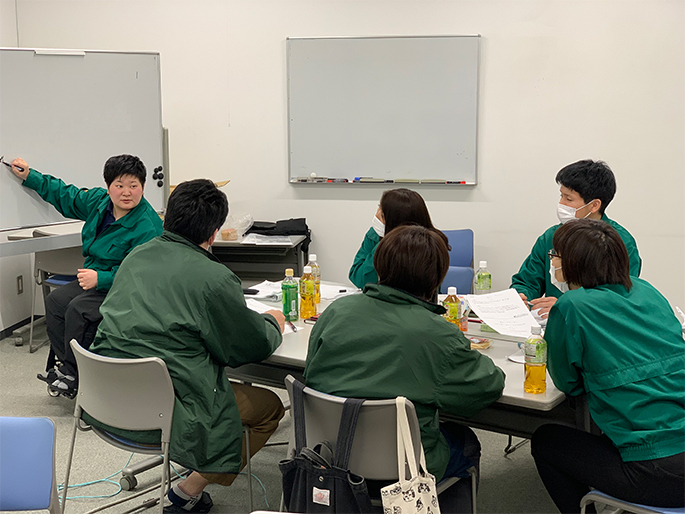 環境の変化は誰もが不安になるものです。そんな時、一緒に悩み・考え・解決策を探すのが『障害者職業生活相談員』と『企業在籍型職場適応援助者(企業内ジョブコーチ)』です。相談員は年2回の社内研修を受講します。研修では「障がい特性の基礎知識」「関係法令」「各種制度」を学ぶ他、事例共有やグループワークを通じてより実践的な対応方法を学びます。加えて、家族や外部機関との連携を強化することで、サポート体制を整え、個人の強みを生かして共に成長できる職場づくりを進めています。