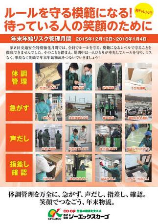 12月12日(土)~1月4日(月)まで、「年末年始リスク管理月間」として、社員一人ひとりが率先してルールを守り、ミスなく、事故なく笑顔で年末年始物流をつないでくことに主眼をおいて取り組んでいきます。