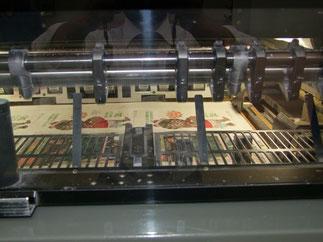 折鶴再生紙に4色が刷られて印刷機を通ります