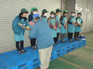 姶良冷蔵流通センター倉庫内で、3月10日付で定年退職された8名の方々の送別会が行われました。この8名の方は姶良冷蔵流通センターが開設され、シーエックスカーゴに移籍する以前から、コープかごしまのセンターで勤務されており、その期間も合わせると20年以上もの間、生協の物流を支え、貢献してくださいました。
