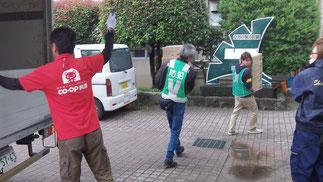 4月24日(日)、支援物資センターから避難所となっている小学校へ、物資を届けている写真となります。