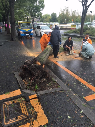 8月22日(月)に関東に上陸した台風9号の影響で、本社・桶川流通センター正門前の植え込みに生えている木が倒れました。根元から車道を横切る形で倒れており、大変危険な状況のため桶川市に連絡し撤去していただきました。