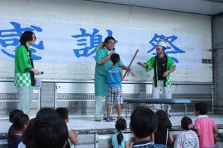 8月26日(金)15時~18時、印西冷凍流通センターにて感謝祭が行われました。台風の不安もありましたが、当日は快晴!およそ200人の方が楽しいひとときを過ごしました。 会場には今年もおいしそうな屋台が並び、原嶋センター長自ら、とうもろこしと蛤を社員とその家族に笑顔でふるまいました。屋台では蛤が大人気で、皆さん「おいしい!」と絶賛!そして、社員お手製のミートソースと、高菜、タラコの3種類の味付けをした、コープのイタリアスパゲッティに舌つづみをうちました。会場では、たくさんの子供たちと、印西市のマスコットキャラクター「いんザイ君」、そして「エコとらちゃん」がステージやお客様が盛り上がるようにお手伝い。一緒に写真を撮ったり、抱き着かれていました。