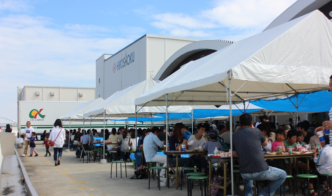 10月16日(日)11:30~14:30、秋晴れの中、神戸営業所で感謝祭が開催され、シーエックスカーゴとケイヒン(株)の社員とその家族を含む、約350名の方に来場いただきました。 ケイヒン(株)と合同感謝祭ということで、それぞれの社員が総出で模擬店を出店!神戸牛に焼き餃子に焼きそば等、とにかく種類が豊富で定番のものから変わり種まで終始たくさんの食べ物で、テーブルがにぎわいました。