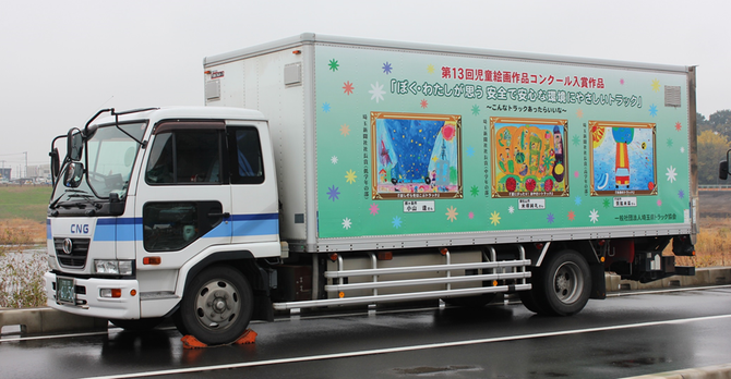 11月19日(土)、埼玉スタジアム2002にて、埼玉県トラック協会主催の「2016交通安全・環境フェア はたらく自動車in埼玉スタジアム2002」が開催され、「こんなトラックあったらいいな 第13回児童絵画作品コンクール~ぼく・わたしが思う 安全で安心な環境にやさしいトラック~」で埼玉新聞社社長賞に入賞した3作品のラッピングトラックとして関東配送センター桶川事業所のCNG車が展示されました。 シーエックスカーゴは、埼玉県トラック協会に所属しており、今回、埼玉県トラック協会よりお声掛けいただいたことで、2014年度から2度目の車輌提供となりました。