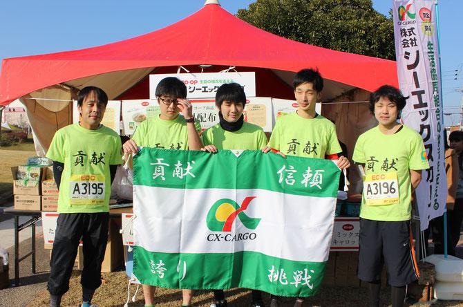参加者は、第2回同様会社ロゴの入ったおそろいのTシャツを着用し、シーエックスカーゴの大旗を背に掲げながら約20kmのコースを走りぬきました。