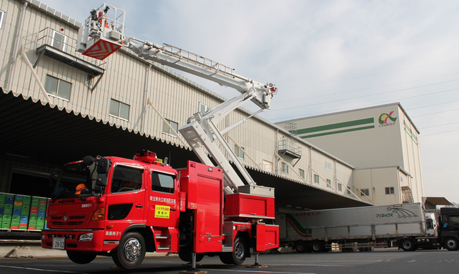 埼玉県内で発生した倉庫火災をうけ、3月1日(水)、シーエックスカーゴ桶川流通センターにて埼玉県央広域消防本部による「緊急立入検査」が行われました。 火災発生時を想定した緊急車両の配置、建物突入経路、消火活動の検証とセンター内の消防設備、避難誘導標識などを中心とした確認が行われました。