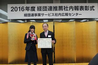 社内報『Smile』が、経団連推薦社内報審査で、雑誌・新聞部門(隔月刊)265作品の中から特別賞として受賞されました。3月15日(水)、経団連会館(東京都千代田区)にて、表彰式が行われ、受賞企業として式典に出席し、経団連事務総長より表彰状の授与と記念品の贈呈を受けました。