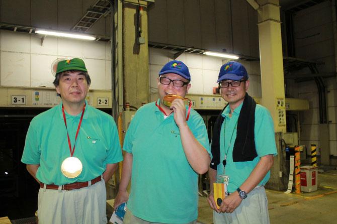 出庫PM班 1位佃さん(左)柳さん(中央)と西海さん(右) 次回もこの座を守るぞ!