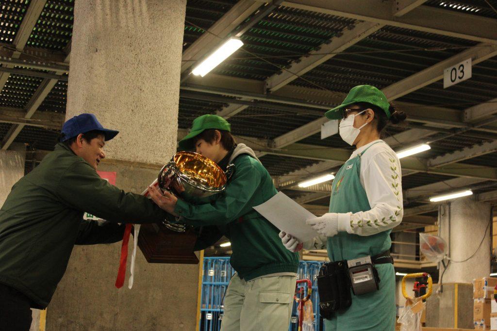148チームの中から頂点に輝いた最優秀賞チーム「キャロット1G入庫班 (入庫ロックンローラーズ)」のキャプテン、副キャプテンが壇上にあがり、流通センター長から表彰状とカップが手渡されると、業務2課のメンバーから盛大な拍手が送られました。