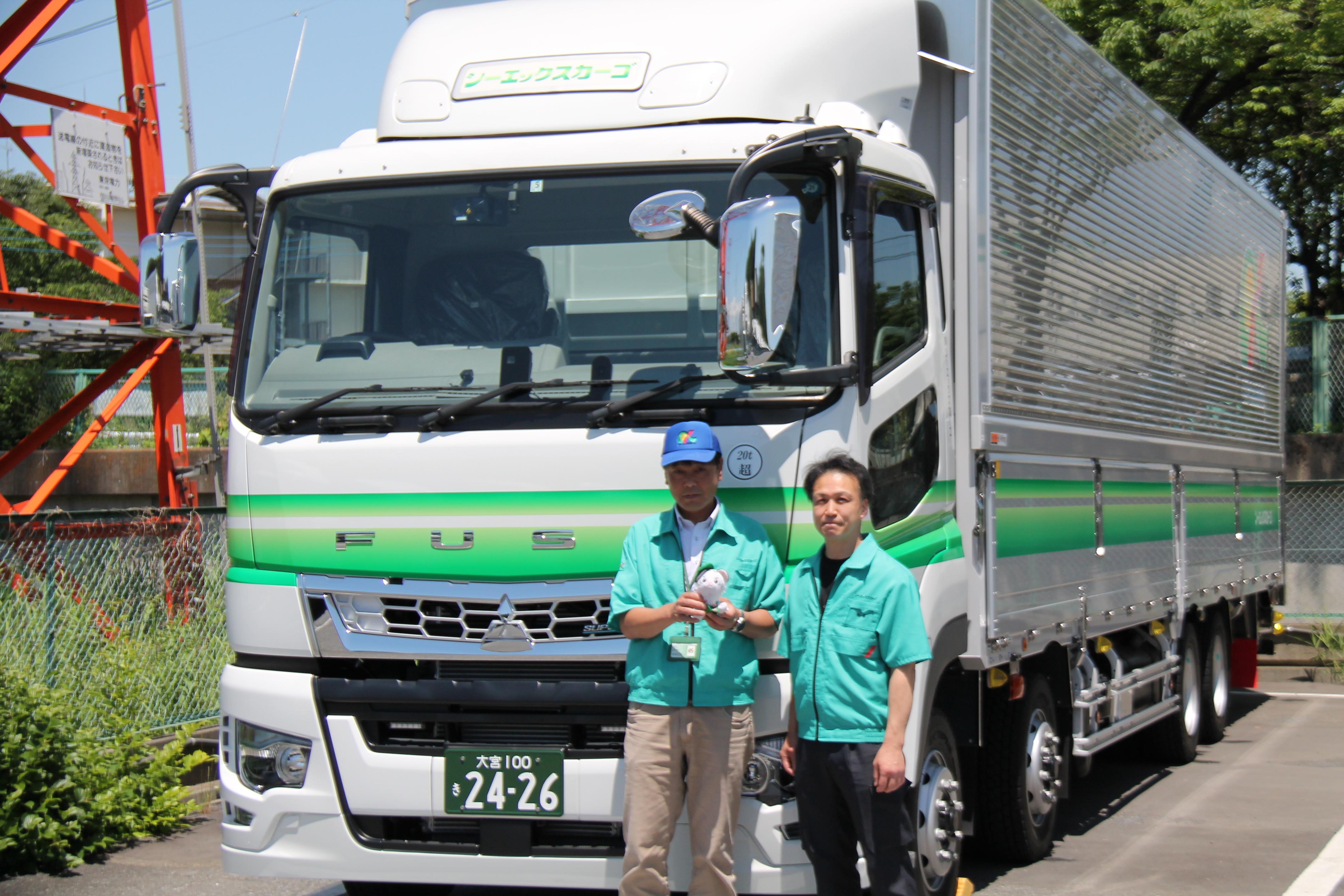 5月30日(木)、清々しい青空の下、昨年に引き続き三菱ふそうの大型車両の納車式が行われました。納車式では全長21メートルのフルトレーラの乗務員も参加し、安全祈願がされました。