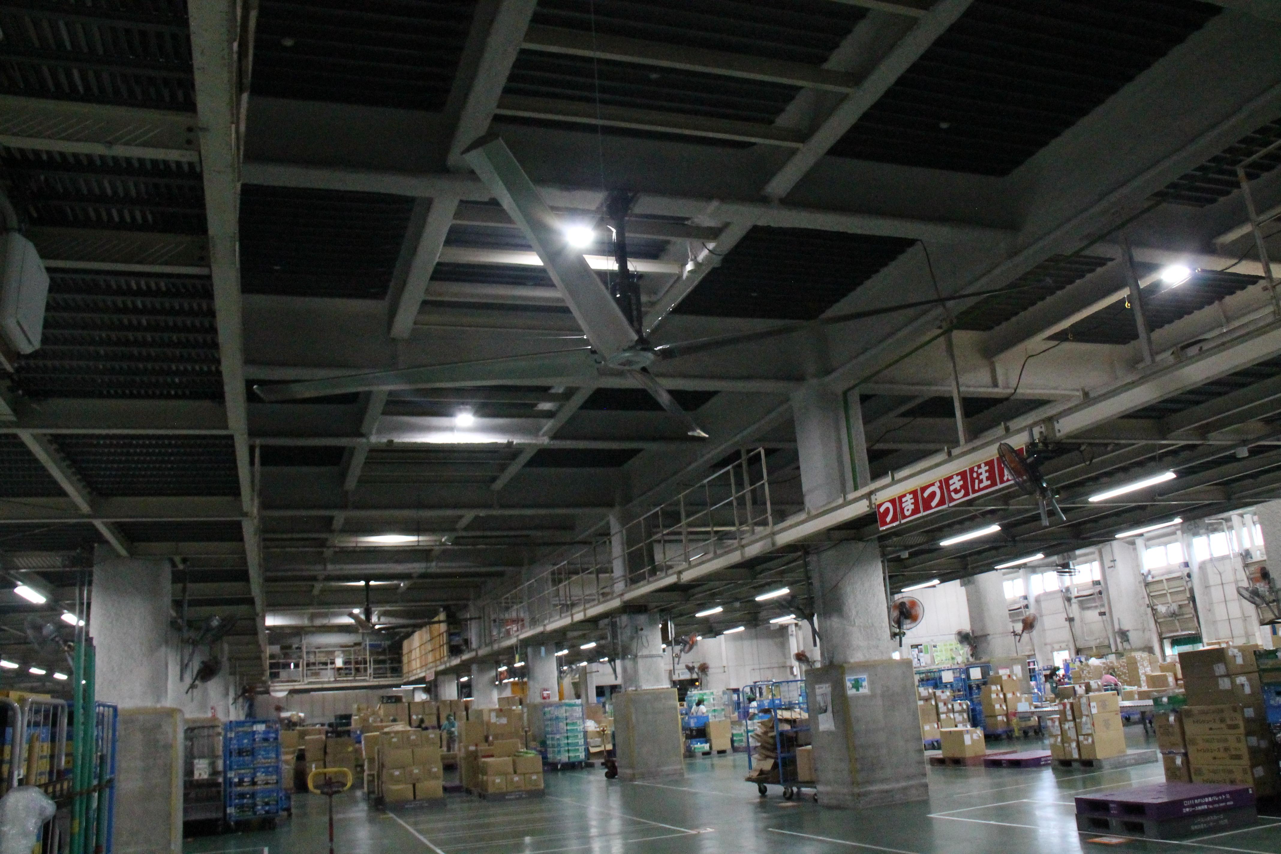 7月18日(木)~19日(金)、桶川TC棟1階で大型空調ファンの取り付け工事が行われました。3メートルの羽根が4枚ついた直径約6メートルもある大きなファンは、近くで見るとその大きさに圧倒されます。意外とゆっくり回転しているファンは、作業場の温度を約5℃下げることができる能力があり、体感温度はその数字以上の効果だそうです。送風というよりも、熱気がこもる倉庫内の空気を動かすことを目的に稼働が始まっています。仕分け作業エリアと小分けラインエリアそれぞれに2基ずつ、合計4基取り付けられ、これから暑くなる季節に向けて、庫内での作業環境向上への期待が持たれています。