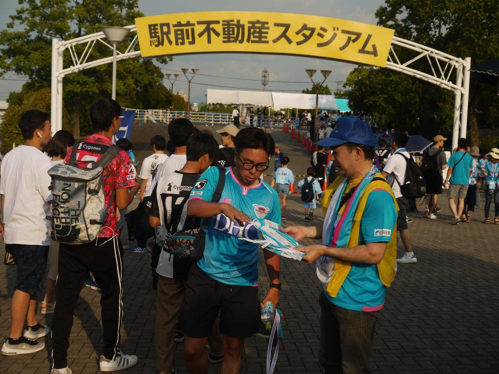 8月4日(日)、シーエックスカーゴが横断幕スポンサーを務める日本プロサッカーリーグ・サガン鳥栖のホーム「駅前不動産スタジアム」で九州決戦(対:大分トリニータ)が行われました。当日は、社員が参加し、来場者1人ひとりに約800枚のうちわを手渡ししました。気温37℃と暑い日でもあり、大盛況のもと、あっという間に配り終えることができました。 うちわには、サガン鳥栖の応援メッセージと同時に、裏面には、シーエックスカーゴのキャラクター「エコとらちゃん」が登場し、会社をPRしました。