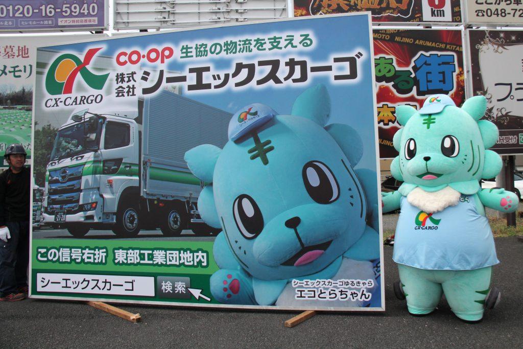 看板は、会社のロゴとトラックをバックに物流会社をアピールしつつ、エコとらちゃんを前面に押し出しています。大きさは高さ2.7m×幅3.6mで、広告棟の上段中央付近の目に付くところに配置されています。夜には、バックライトで照らされ昼とはまた違った雰囲気です。通りかかった社員からは「夜でも明るくて、トラックとエコとらちゃんが目立っていいね!」との声も入りました。3年間掲載され、シーエックスカーゴの存在をアピールできそうです。