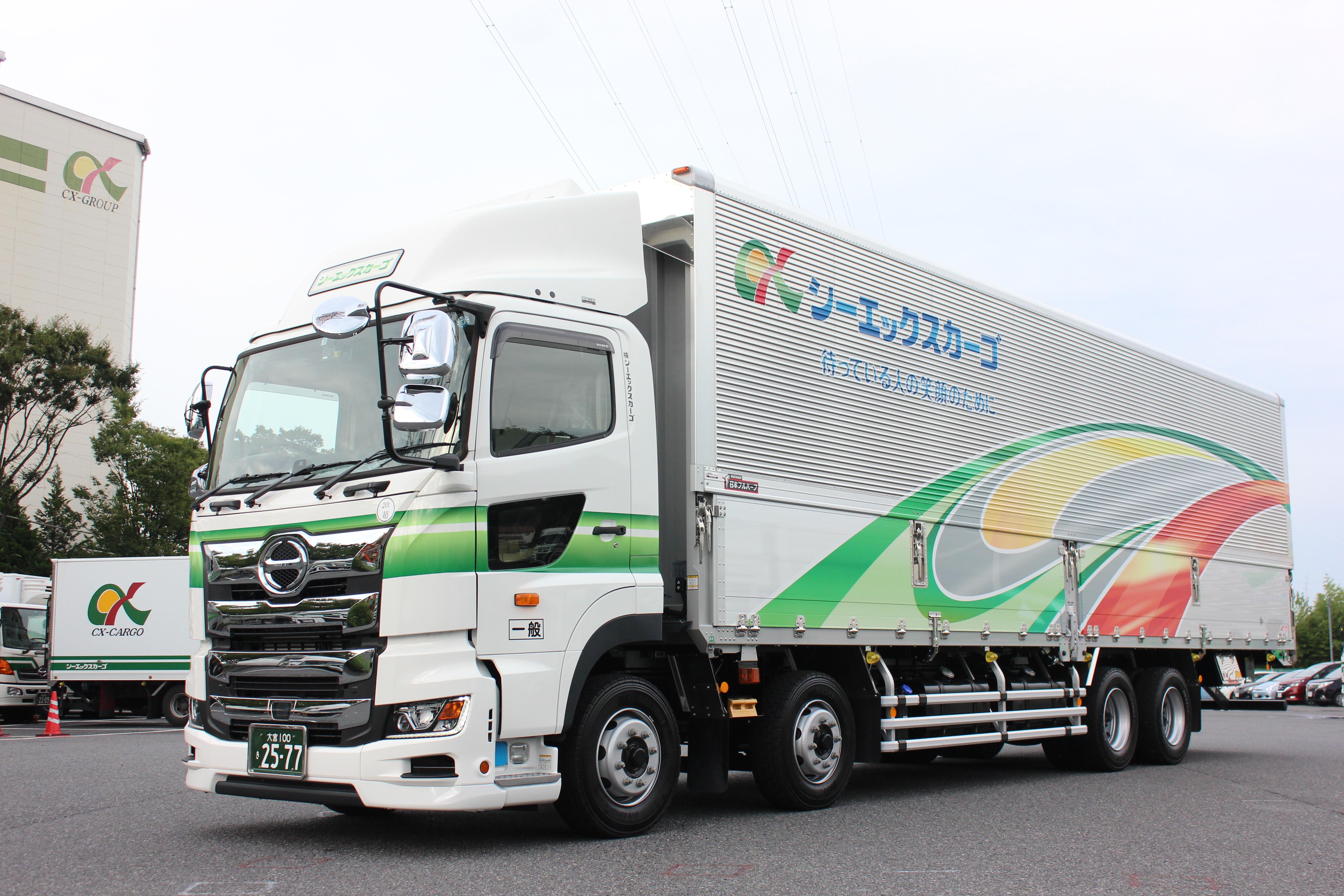 車体は日野自動車株式会社様の『プロフィア』、荷台は日本フルハーフ株式会社様と従来の仕様を踏襲し、セーフティー機能もフル装備されています。また、シーエックスカーゴで導入しているトラクタ仕様トラックのエンジンパワーは、社内では他を寄せ付けない力強さの410馬力を誇ります。これには、乗務員からも「トレーラを連結していない単車状態では、最大積載重量時に発進や坂道走行が楽でいいね!」と期待の声が出ました。
