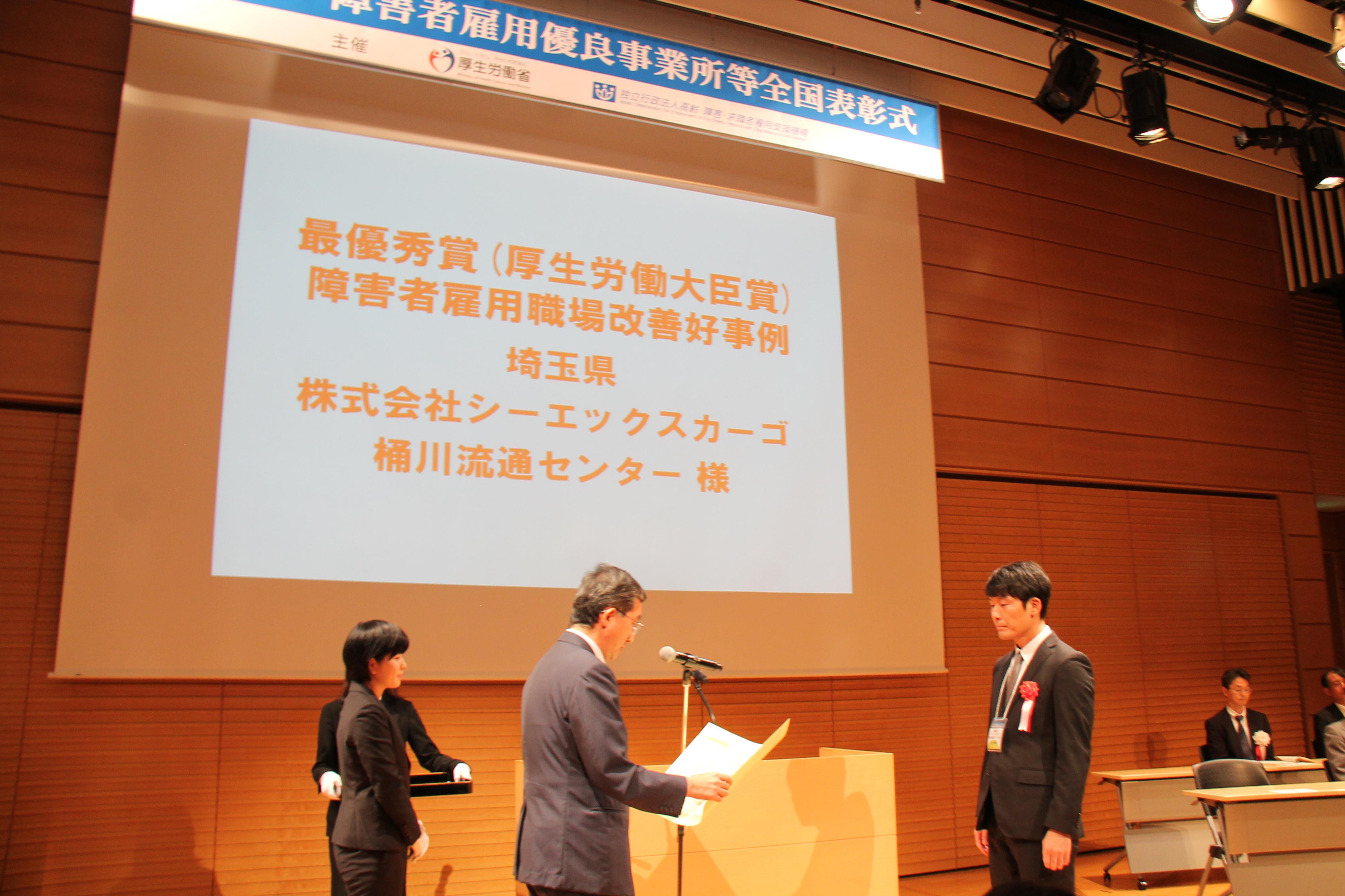 シーエックスカーゴは、障害者雇用において雇用や労働環境などの改善や工夫を行っている好事例事業所として、「障害者雇用職場改善好事例 最優秀賞(厚生労働大臣賞)」を受賞し、厚生労働審議官から桶川流通センター業務3課課長が表彰状を受け取りました。