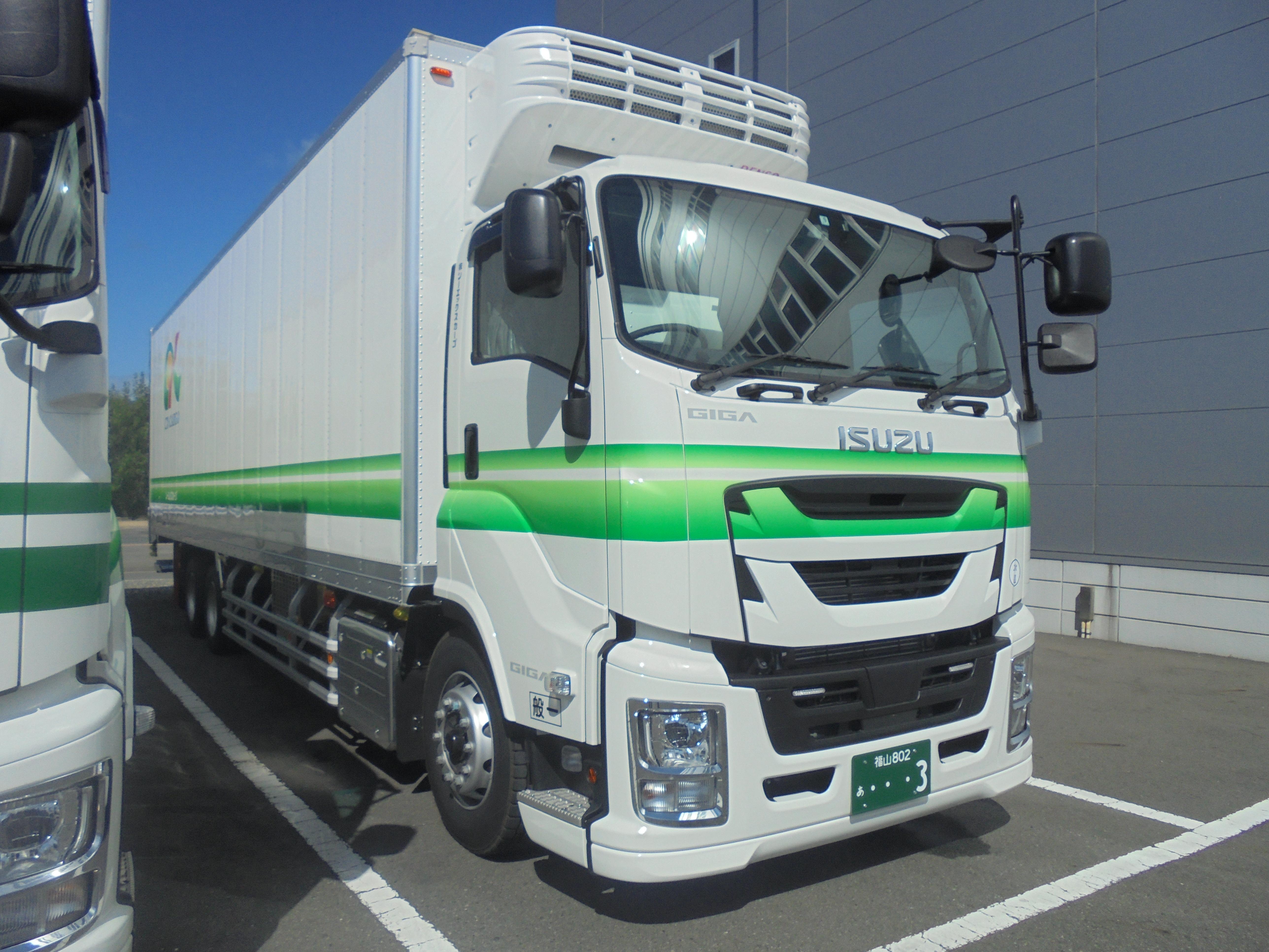 今回の車両は、車体はいすゞ自動車株式会社製『GIGA』で、ボディーは日本フルハーフ株式会社製ですが、神戸営業所や九州配送センターで最近納車された冷凍車とは異なり、格納式パワーゲートを装備しています。また、冷凍機は株式会社DENSO製の直結式前後ツーエバー方式で、冷凍冷蔵の混載も可能。車体はフルオートマに衝突安全装置などが装備されています。セットセンター配送に配備され、仕様を新たにしたことによる活躍が期待されます。