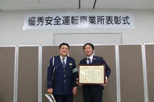 | 11月13日(水)、兵庫県警察本部にて令和元年第二期優秀安全運転事業所表彰式が行われ、小野営業所輸送課が金賞を受賞しました。 この賞は、5月から8月までの間に乗務員の運転記録証明書を一括申請した153事業所の中で、過去一年間職場が一丸となって積極的に交通安全に取り組み、交通事故・違反防止に優秀な成績を収めた企業に送られるもので、成績に応じて、金賞・銀賞・銅賞の3賞に分けられました。 表彰式に参加した社員からは「小野営業所輸送課では、無違反の期間が1,500日を超えました。金賞を受賞したことで日頃の取り組みへの励みになります。道路交通法を守ることは当たり前ですが、その当たり前のことが難しい、乗務員の日々の努力のおかげです」と、乗務員へ感謝の気持ちを示しました。 |