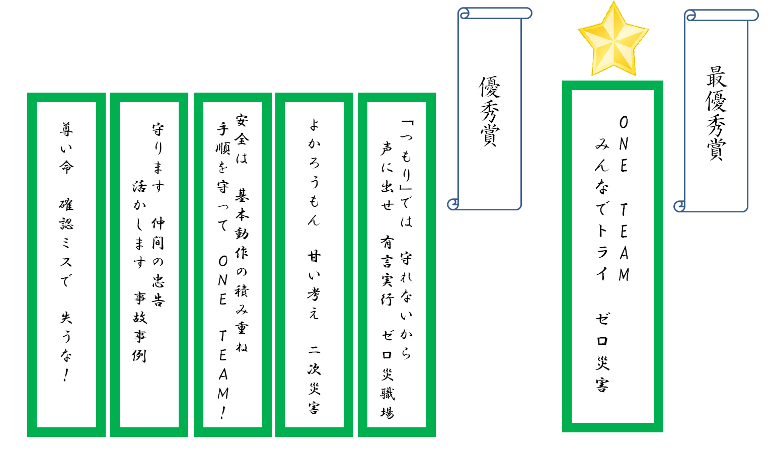 この安全標語は、社員からの声で公募が実現し、12月1日(日)から1月15日(水)までの間で行われる年末年始無災害運動の一環で行われました。12月初旬に応募を受け付け、社員のみならず派遣社員や常駐業者など総勢450人が参加。班、グループでの選出を経て、最終投票にて最優秀賞が選ばれました。受賞した社員は「すごく嬉しいです」と語り、上司からも感嘆の声が上がりました。受賞作品は、期間中センター内に掲示されます。