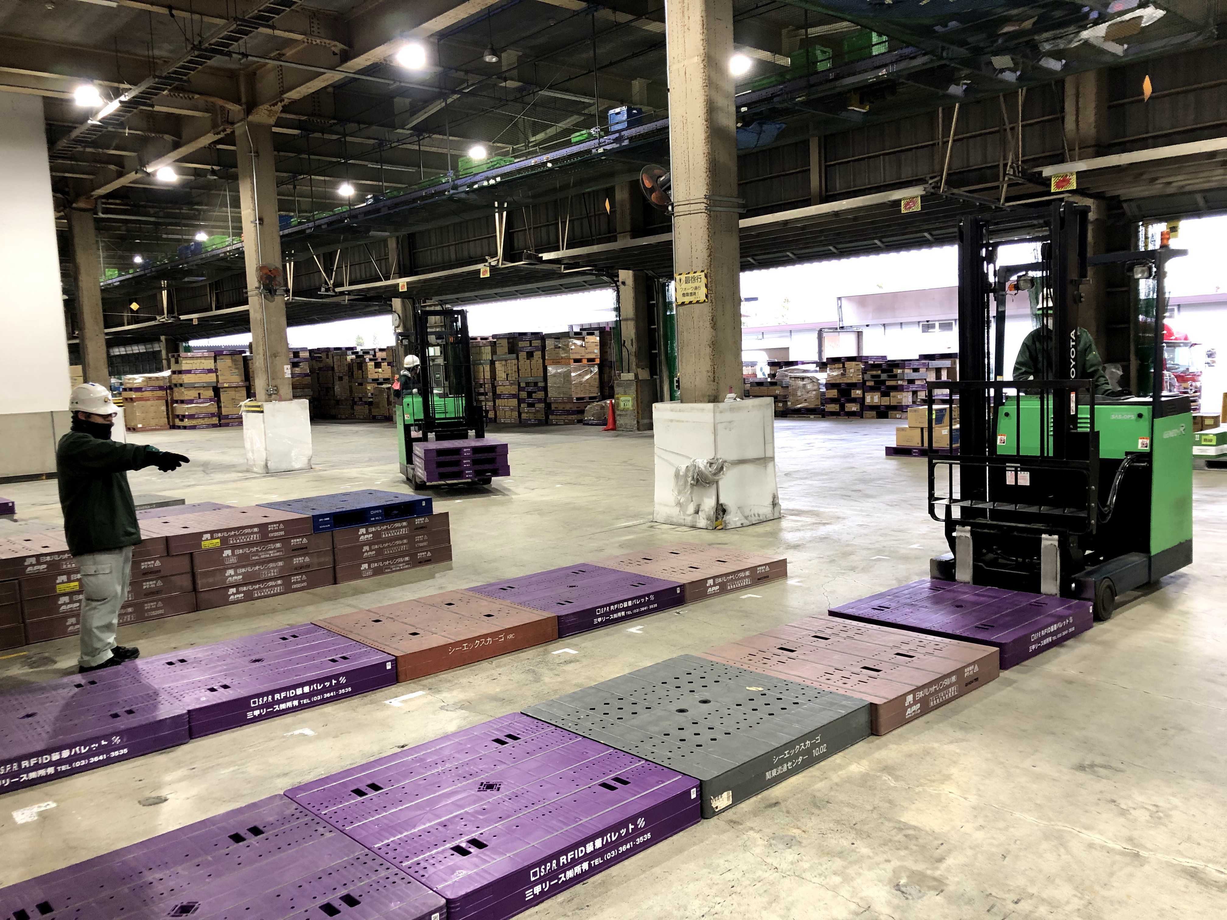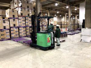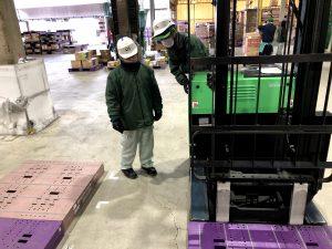 1月7日(火)、桶川流通センター業務1課の入社1年目社員2人が、フォークリフト運転技能講習終了証を取得したことから、いよいよ庫内で実践に向けた練習をスタートしました。