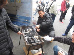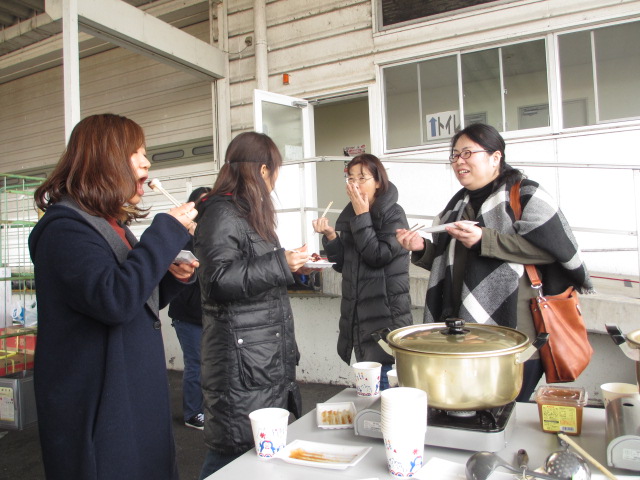 当日、4升の紅白餅のほか、豚汁、バーベキュー、参加した乗務員が釣ったイカなどが振舞われました。参加した社員からは「つきたての餅や豚汁、イカがとてもおいしかった」「営業所でのイベントで楽しく過ごせた」など、餅つき大会を満喫した声が上がりました。