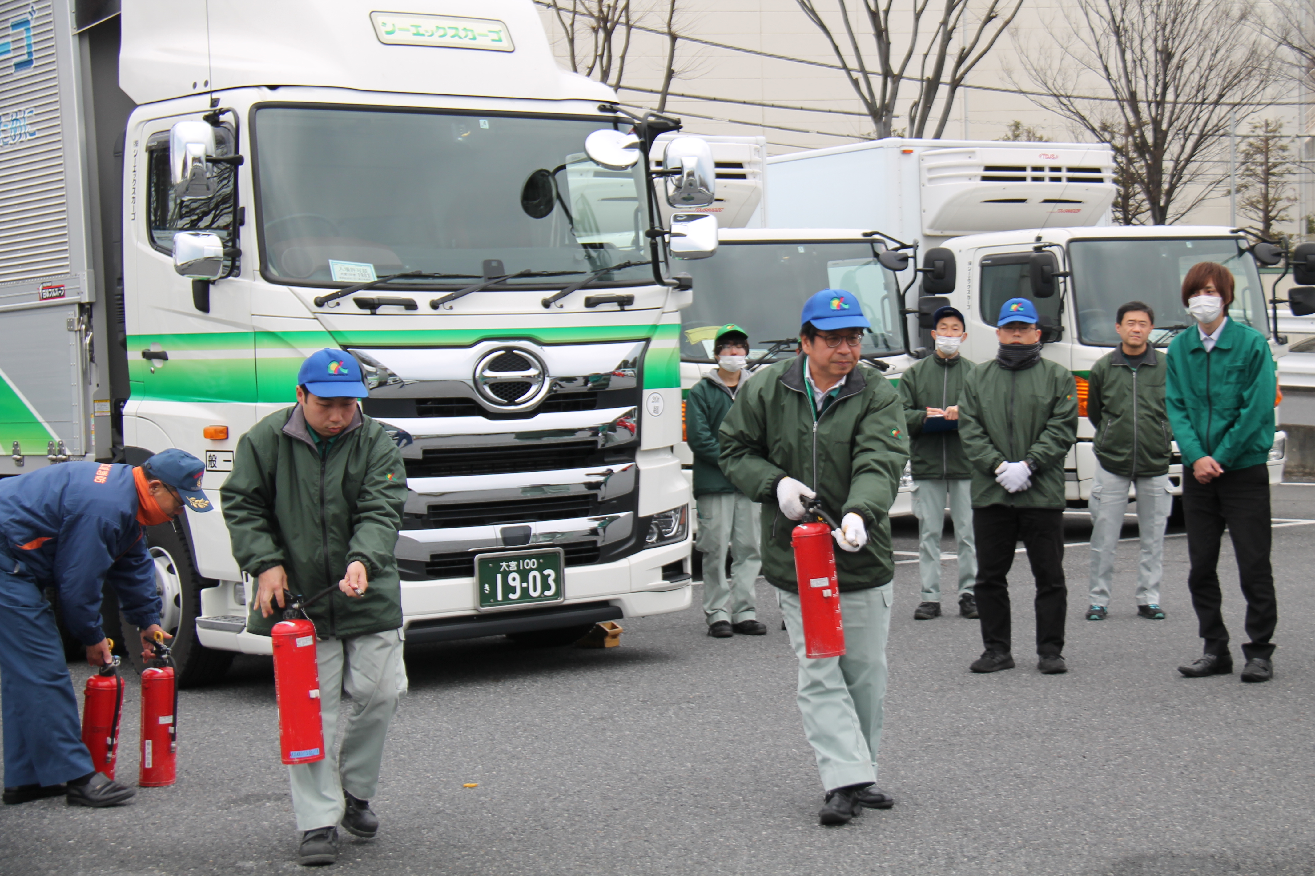 1月22日(水)、桶川流通センター・本社合同で昼と夜の2回に分けて、避難訓練が行われました。センター3階からの出火を想定して行われ、それぞれの避難経路で社員の誘導により駐車場へ避難しました。避難後、初期消火訓練に参加する社員が消火器での消火体験を行いました。
