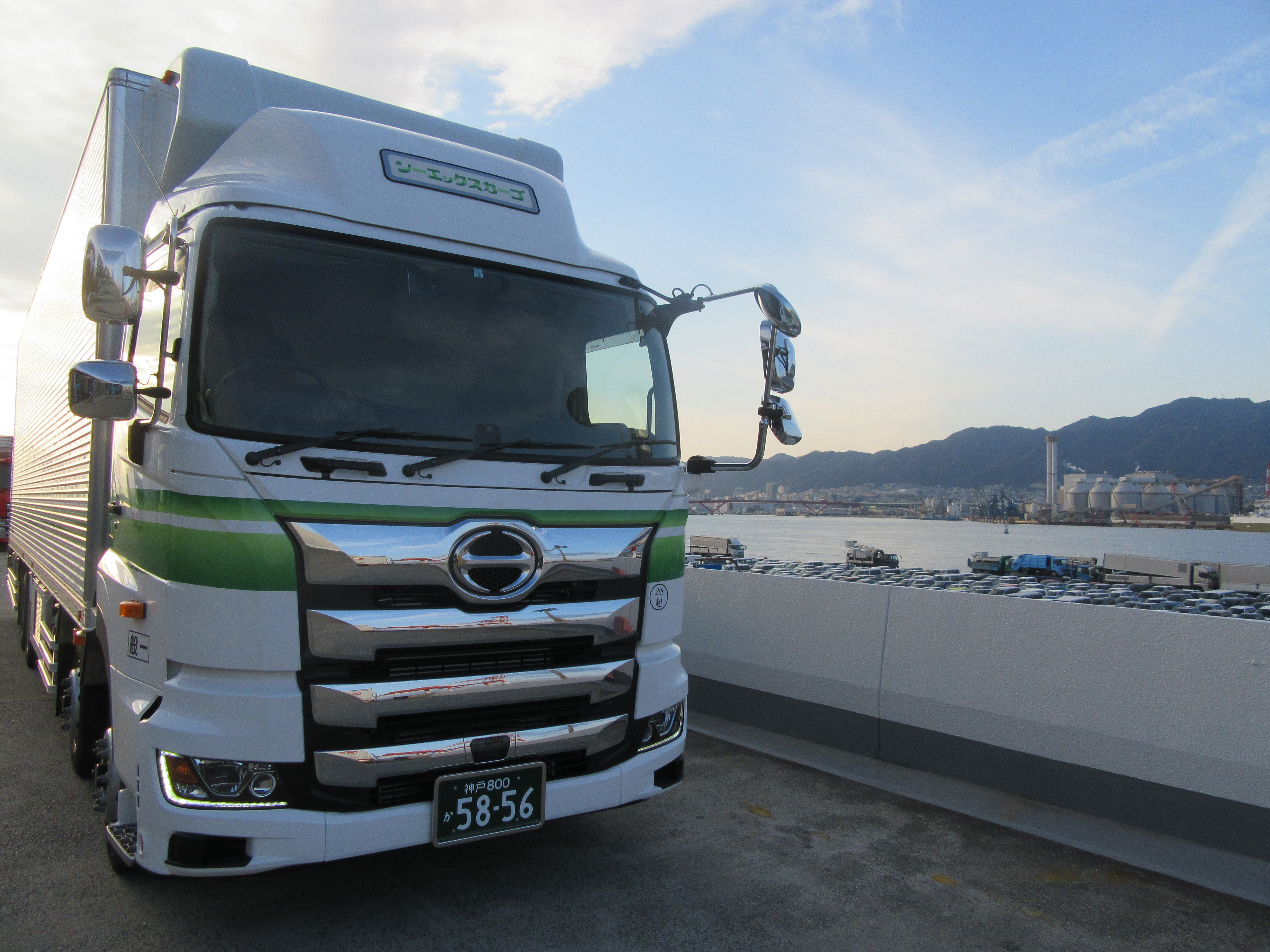 1月24日(金)、納車日和な晴天の中、神戸営業所に大型冷凍車、小野営業所に大型ドライウイング車が納車されました。どちらも「日野プロフィア」をベースに、それぞれの営業所の業務内容に合わせた仕様で製作されました。今回も交通事故防止のための安全運転支援機能を重視して、左折時の左後側方視界補助カメラを装備し、巻き込み防止機能を強化しました。
