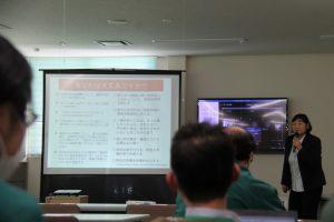 研修の後半には、広島冷蔵流通センター、商品管理部、尾道流通センターをテレビ会議でつなぎ、それぞれの取り組み報告にて職場環境改善の事例を共有しました。最後に講師からの声掛けにより、自部署に戻ったあと始めに着手するアクションを参加者同士で発表しあい研修を終了しました。