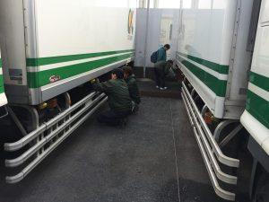2月14日(金)、事故防止委員会が主体となり、乗務員、主任、整備管理者の14人が参加し、全車両の点検を行いました。トラックの側面に付いている工具箱や、タイヤの泥よけ、スペアタイヤ、バッテリーなどを普段から確認できているか、整備管理者がポイントを伝え、参加者全員で手分けをして点検しました。