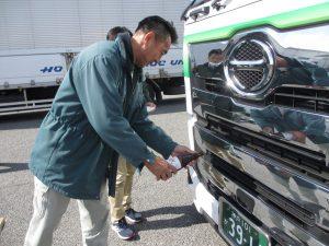 担当乗務員からは、「きれいなトラックを運転することができてうれしい。これからも仕事を頑張ります!」と喜びの声が上がり、管理者からは、「きれいな車両で気持ち良く仕事をして頂き、安全運転を続けてほしい」と乗務員への想いが伝えられました。