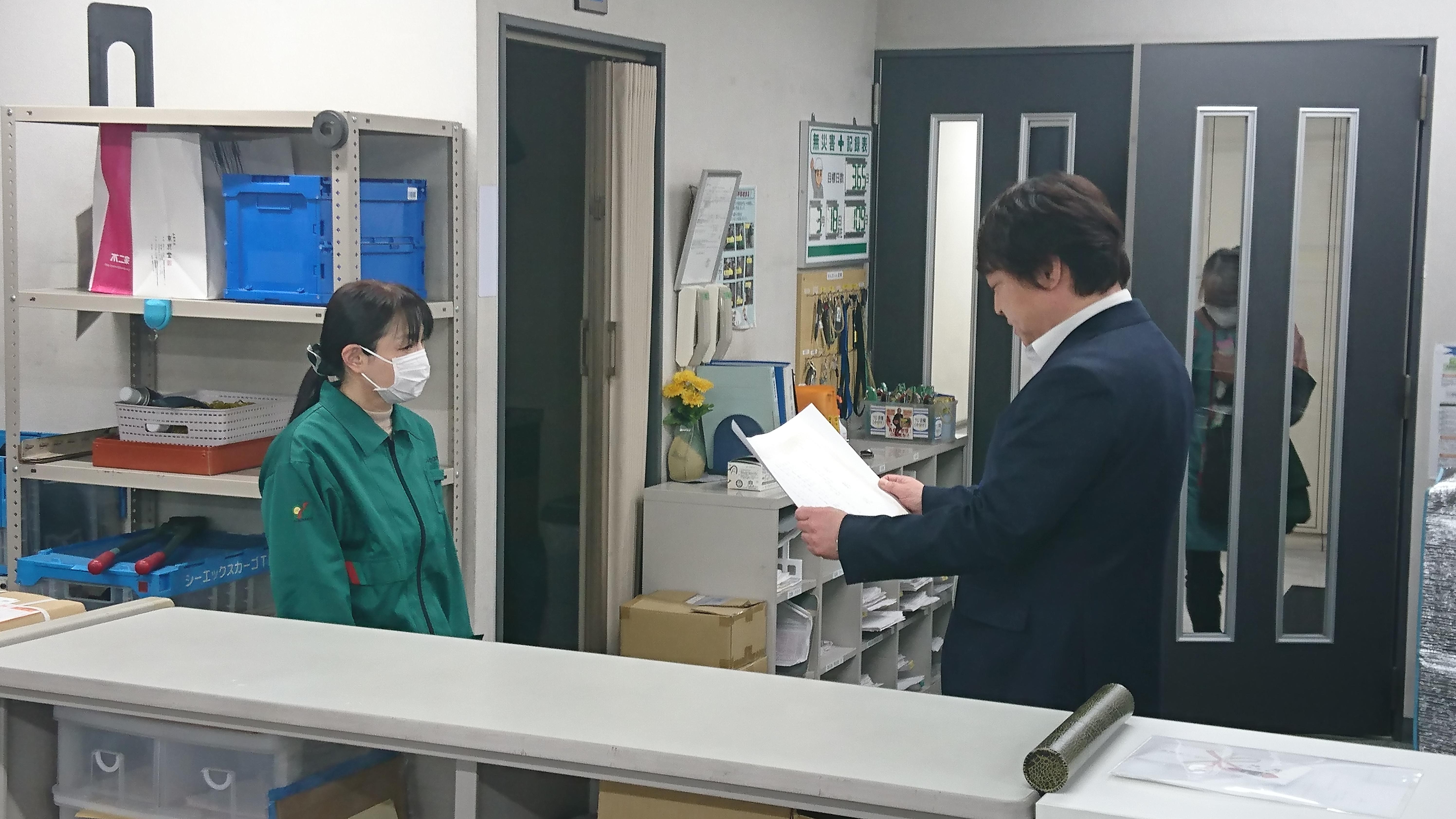 3月18日(水)、小牧営業所にて勤続20年表彰式が行われました。表彰式は事務所で行われ、仲間に見守られながら表彰状を受け取りました。表彰者は「20年間続けてこられたのは、みなさまの助けがあったからだと思っています。これからも頑張ります」と、感謝の言葉と共に今後の意気込みを語りました。