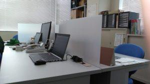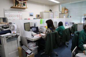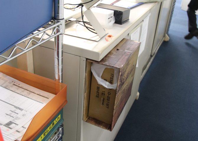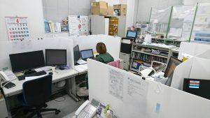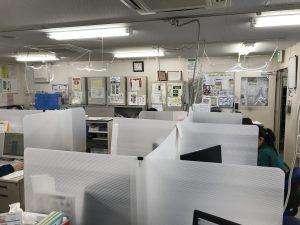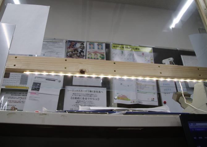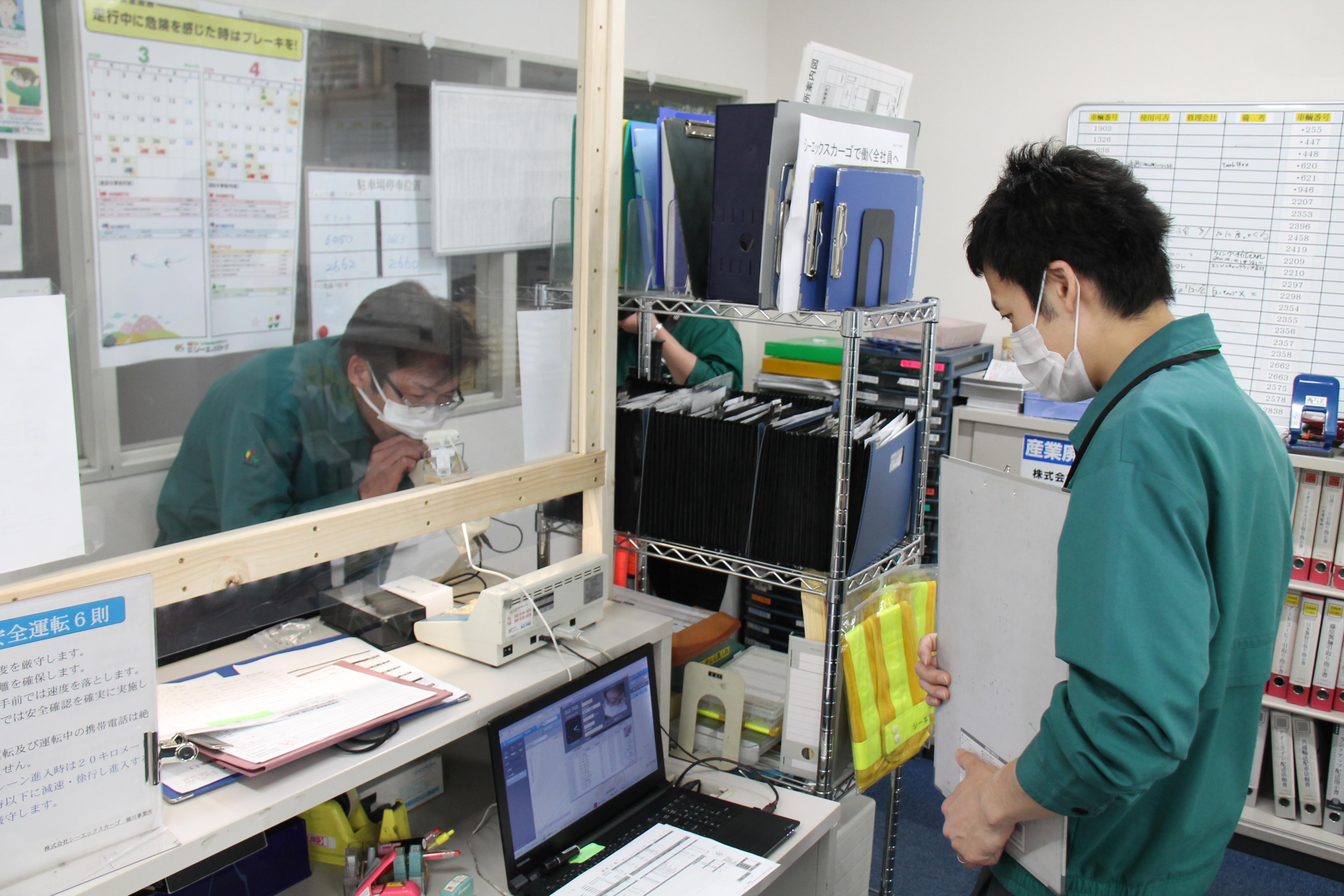 業務上座席の分散が難しいため、机に高さ60cmの簡易的な壁を設置し、お互いの接触を避けつつコミュニケーションが取れるよう、ビニールを張った窓も付けました。管理者の在不在が一目で分かるよう立て札も立てています。関東配送センターの他事業所でも、同じように手作りのパーテーションを作成しました。社員からは、さらに仕事に集中できるようになったとの声がありました。