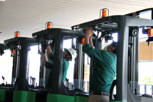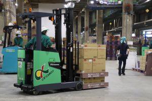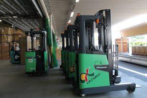 今までフォークリフトが足りず、レンタルをしてしのいでいましたが、今回5台納車されたことでフォークリフト不足が解消されました。納車された車両にはシーエックスカーゴの大小のロゴが入っており、走行中に進行方向を知らせる青いランプも装備されています。バック走行中に死角となる場所に作業者がいた場合、フォークリフトが近づいていることを作業者に知らせることができるため、安全に作業することができます。