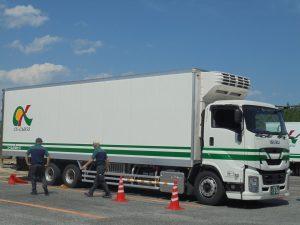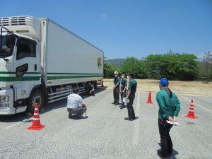 8月の本稼働に向け、中四国配送センター広島冷蔵班に新たに5人の乗務員が入社し、新規採用乗務員研修が行われました。この研修は初任運転者研修として法で定められているもので、トラックドライバーとしての心構えや車両の構造・特性などを知り、それに関わる安全について学ぶためのものです。乗用車を運転するよりも人命に与える影響が大きいことや、商品を遅延なく確実に配送すること、それら全てに安全が関わっていることなど、安全・安心を重点とした内容となっています。