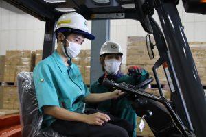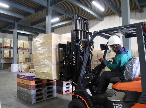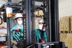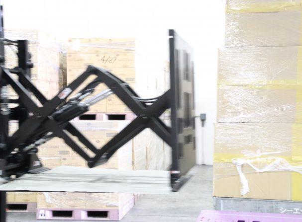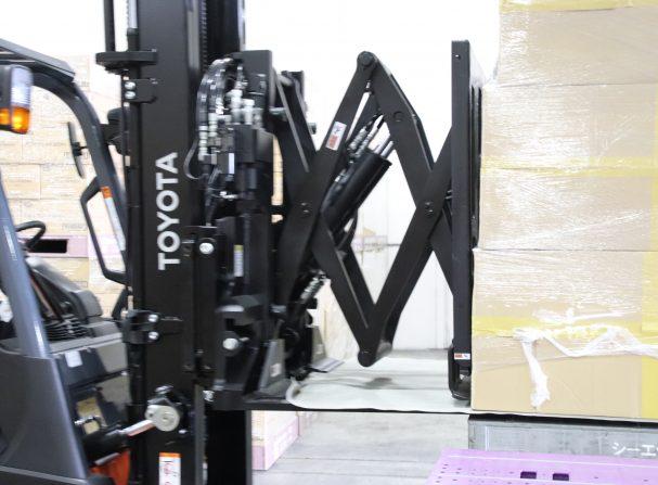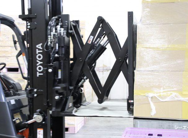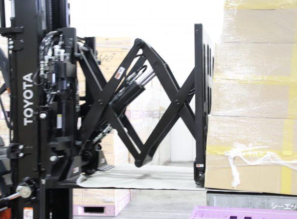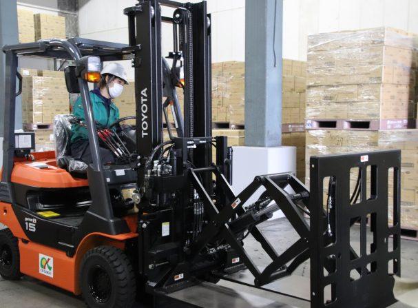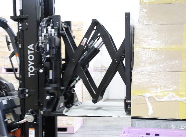 | このフォークリフトでは一般的なパレットは使わず、シートパレットと呼ばれる薄いシートを使用します。一般的なパレットの高さが約15センチであることに対して、シートパレットは3~7ミリほどと薄いため、その分運搬の際にトラックに積める量が増えたり庫内のスペースの有効活用が期待されます。プッシュ(押し込む)とプル(引く)の動作で、荷物を積む・シートをつかんで引き抜くなどの作業ができます。研修中の社員は「レバーやボタンも一般的なフォークリフトより多く、今までとは全く違う動きになるため操作がとても難しい。練習には時間が必要だが、早く乗りこなして業務に役立てたい」と話しています。 |
