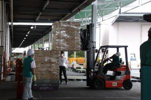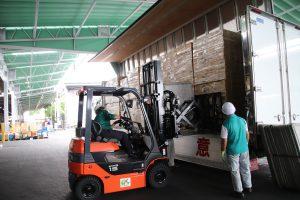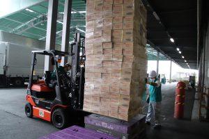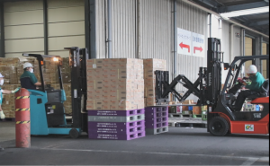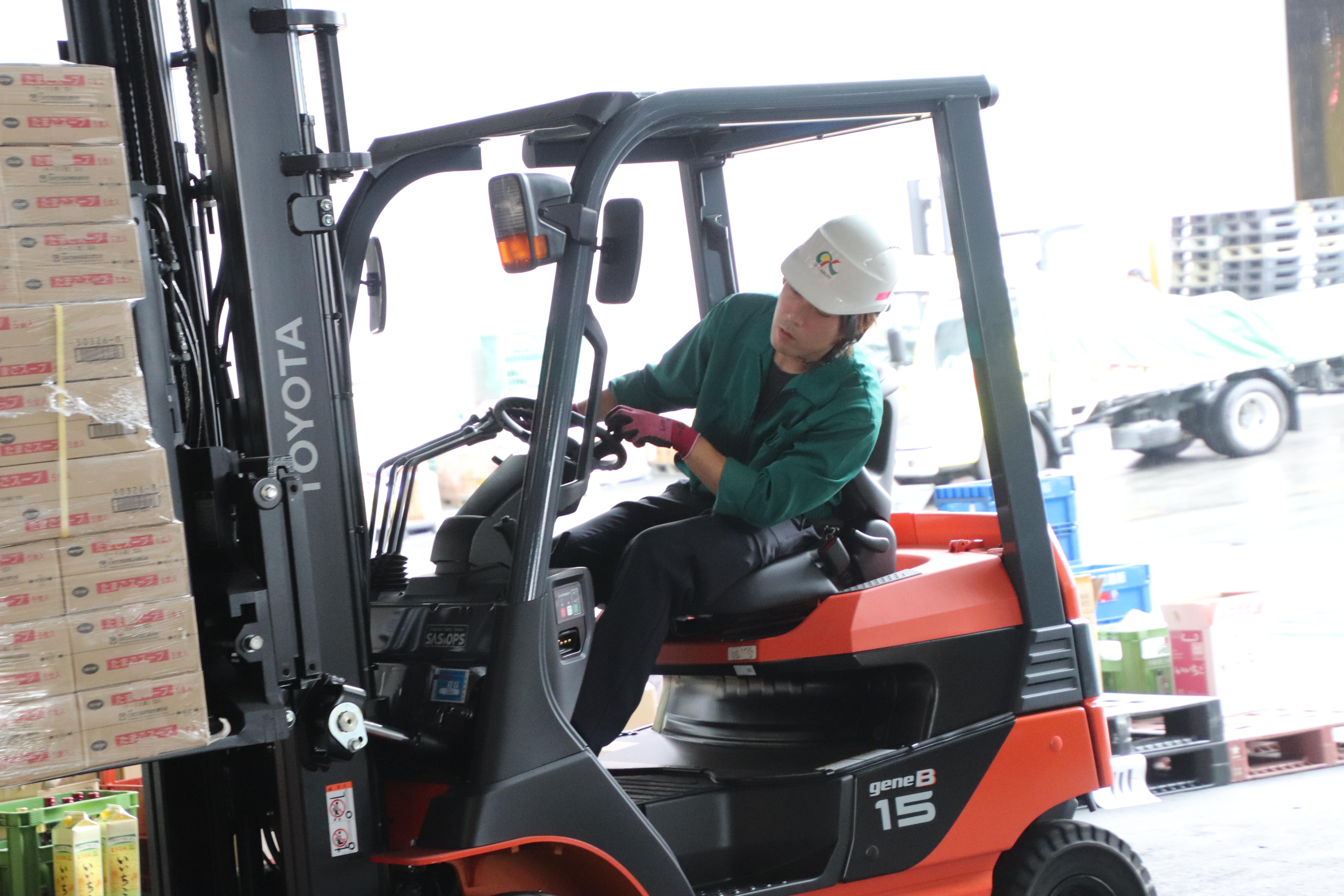 管理者が見守る中、慎重に安全に商品を扱う