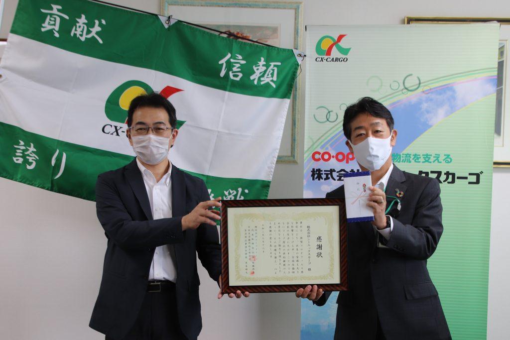 7月16日(木)、コロナウィルス感染症の影響をうける中で、組合員の生活に欠かすことのできない商品の供給継続へのお礼として株式会社コープクリーン(以下:コープクリーン)と日本生活協同組合連合会の連名で、シーエックスカーゴに感謝状をいただきました。