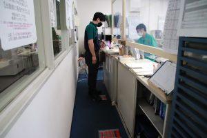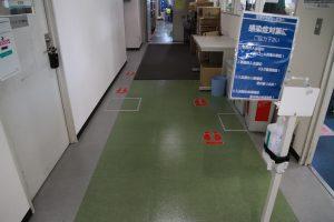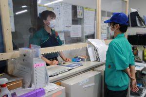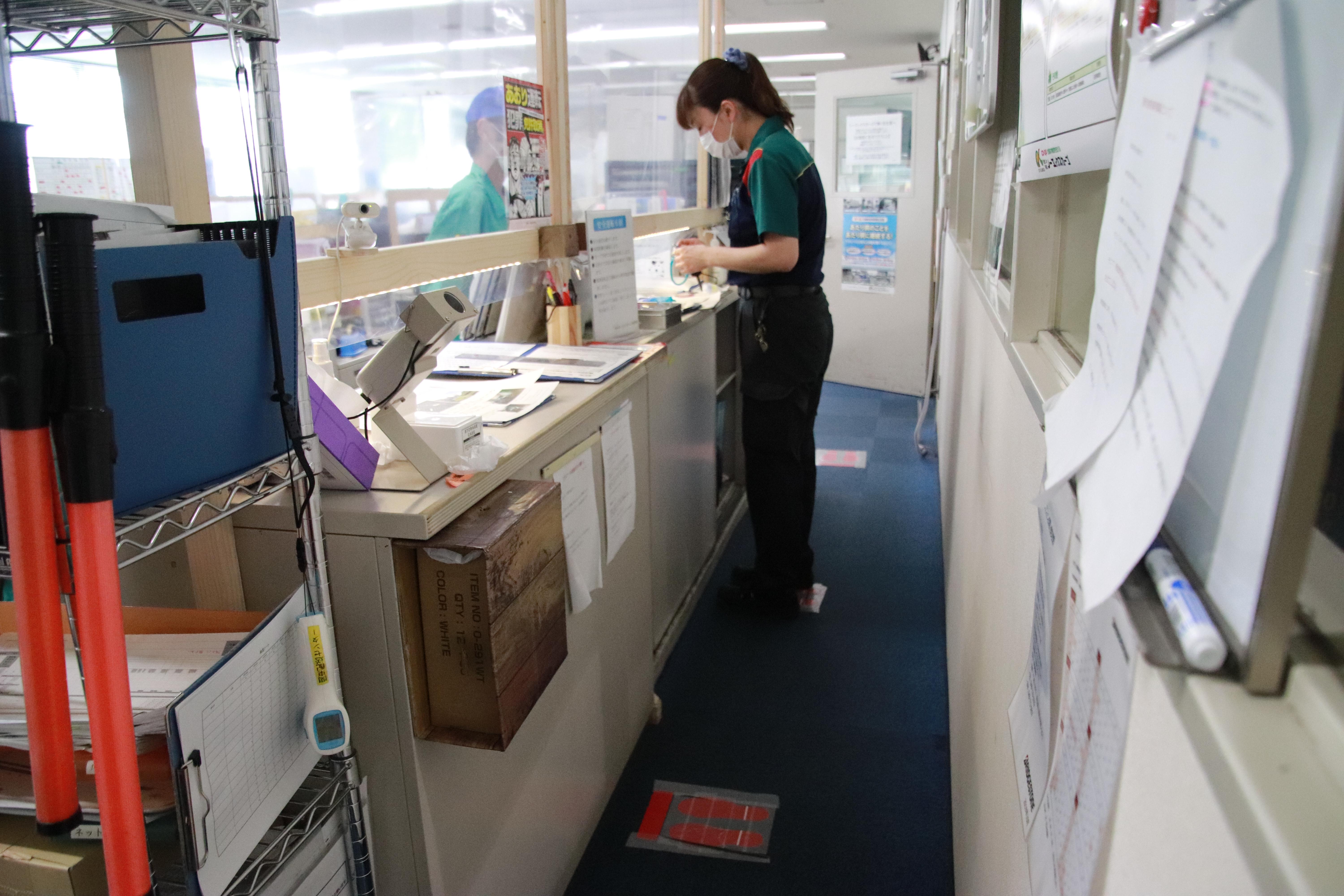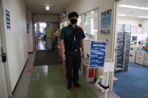 現在、関東配送センター桶川事業所で、点呼場周辺のレイアウト改善を行っています。点呼に集中しやすい環境にするために、鍵の引き渡しなど一つずつしっかりと行えるよう、机の前の床に、立ち位置を示す足型マークをつけました。また乗務員が点呼待ちをする廊下では、出勤人数が多くなる時間帯の密を避けるため、約1m間隔に足型マークをつけ、ソーシャルディスタンスにも配慮しました。