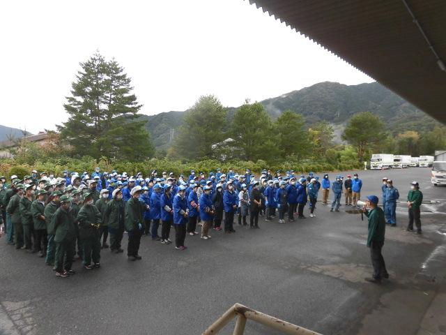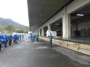 10月8日(木)、広島冷蔵流通センターで消防訓練を実施しました。今回の訓練は、火災や災害時に迅速かつ落ち着いた自衛消防活動を身に付けるとともに、社員の防火意識を高めることを目的として行いました。自社社員だけではなく、委託先や関連会社の方々を含め昼間は130人、夜間75人の二部構成で、200人ほどが参加しました。