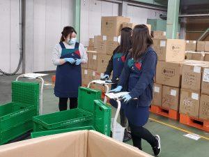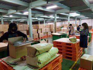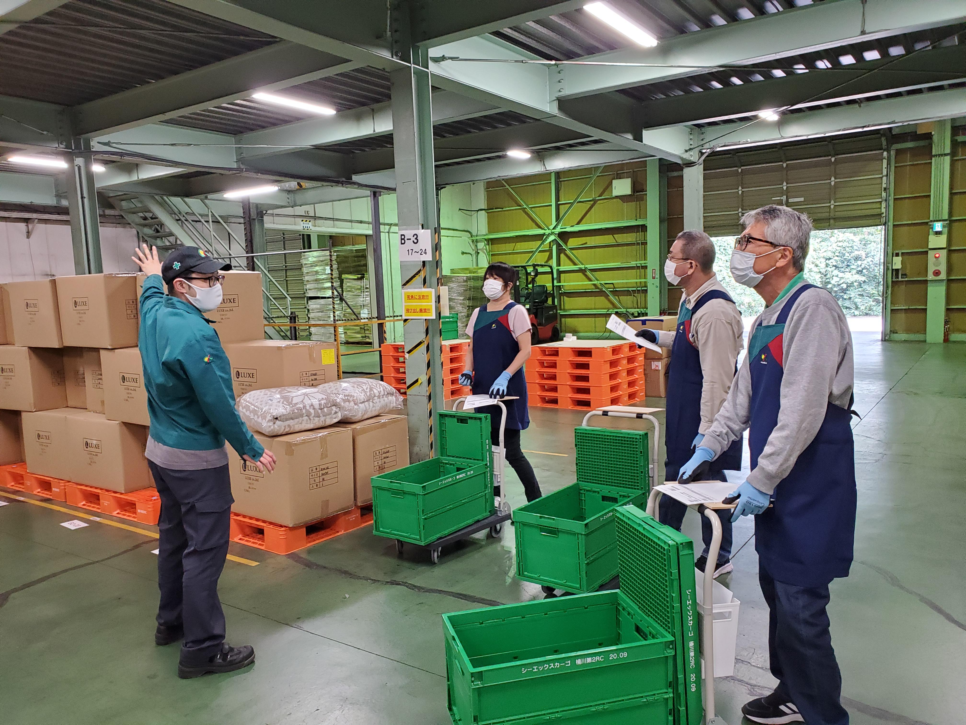 10月1日(木)より、新たに22人の社員を採用し、通販業務の一部を先行してスタートしました。通販事業では、アパレル商品や布団カバーなど軽寝具商品を取り扱っています。新センターの桶川第2流通センターがオープンするまでは外部倉庫での作業となり、現在はハンディと紙帳票を使用して集品し、社員の手で丁寧に梱包を行っています。