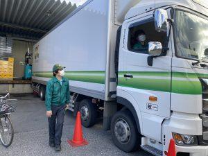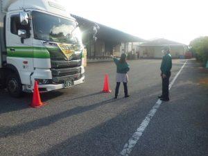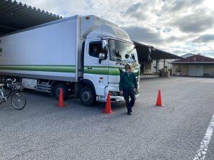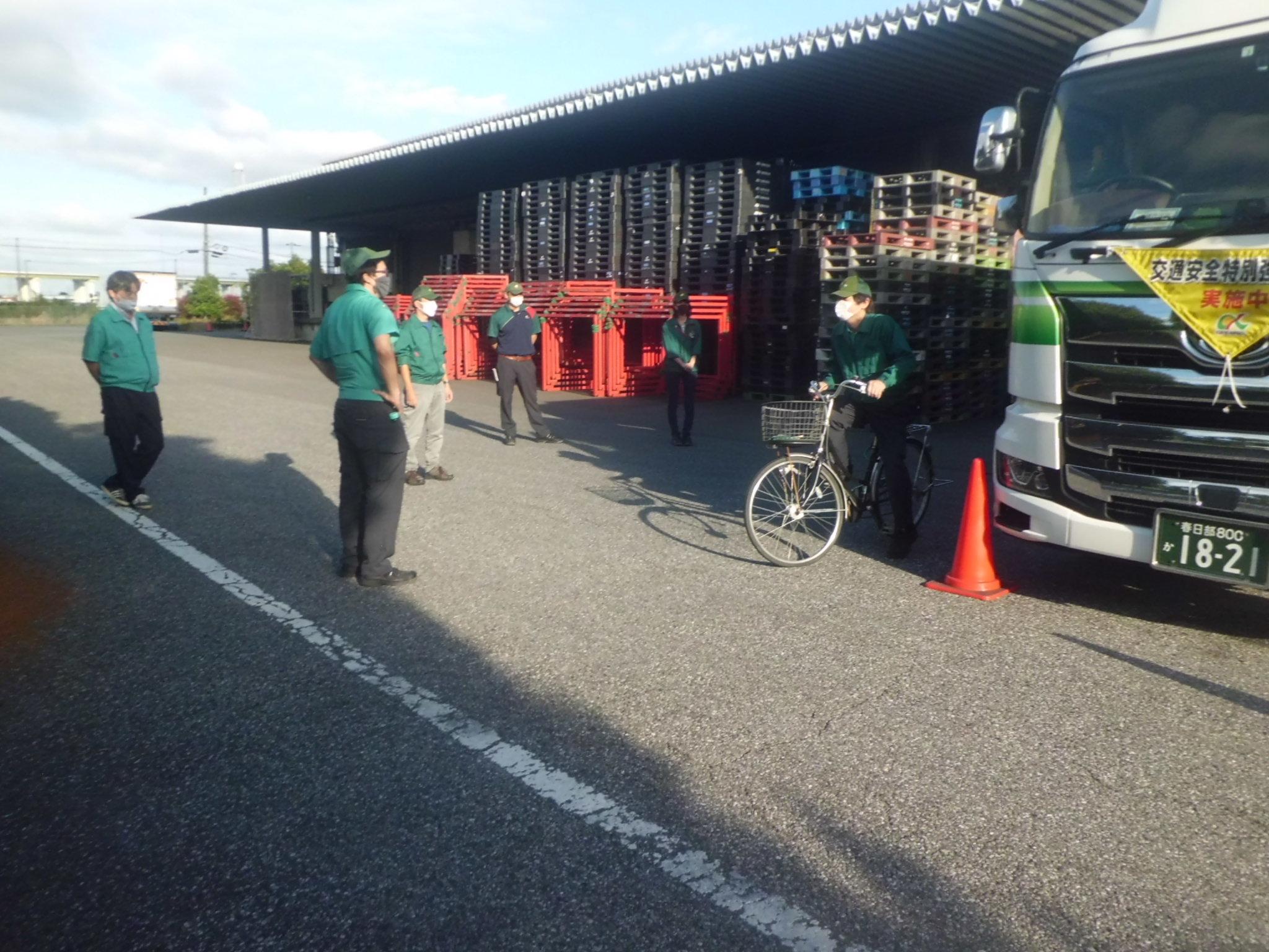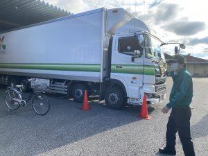 関東配送センター久喜事業所・久喜営業所では毎年、交通安全特別強化月間中の取り組みとして、トラック視点での見え方についての死角体験を行っています。乗務員と事務員を交えての開催で、トラックの死角部分に自転車とカラーコーンを設置し、実際にトラックに乗車した際、死角にあるものがどのように見えるかを体験しました。実際に乗車してトラックからの視点を確認し、危険箇所である死角を体験することで、トラック周辺が危険だと感じてもらうことを目的としています。