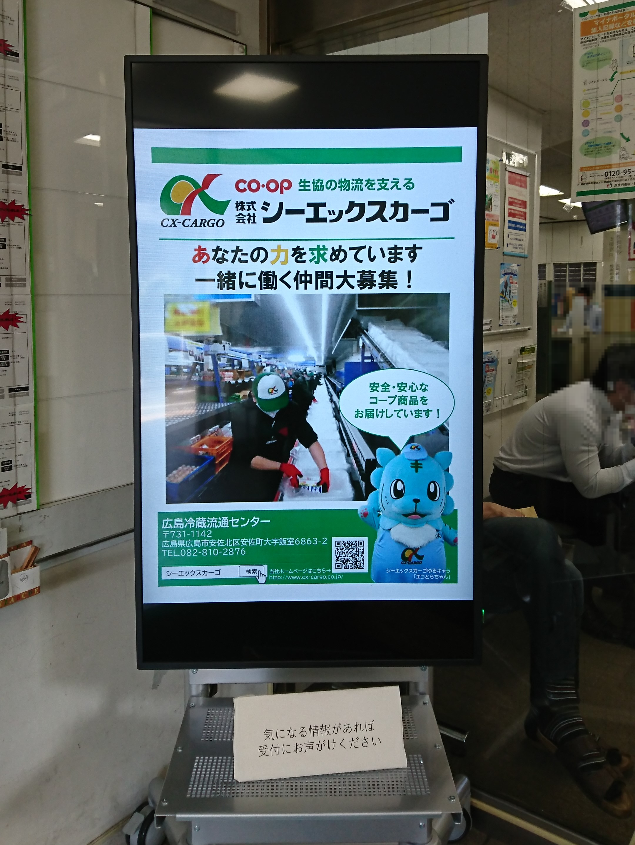 10月の上旬より、ハローワーク可部(可部公共職業安定所/広島県広島市)玄関口のモニターに、広島冷蔵流通センターのPR企業情報が掲載されました。このモニターは10社ほどの企業情報が5秒ごとに切り替わる仕組みです。コロナ禍の影響で会社説明会の中止が相次ぐ中、求職者への周知が難しくなっています。さまざまな制限がかかる中で、少しでも多くの方にシーエックスカーゴを知ってもらえるように!という思いから、このモニターへの掲載を行っています。