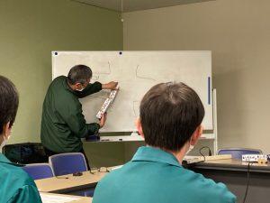 | 座学では、トラクタとトレーラの構造・特性、トレーラの点検整備、トレーラの特性に合わせた運転やトレーラ特有の現象についての研修を行い、実地では、実際に車両を見て構造を理解し、構内で車両操作の確認、ハンドルを切った際の死角や後退動作などの基本動作研修、センターの外周(公道)を回って右左折時の運転研修などを行いました。 |