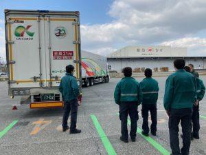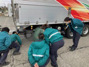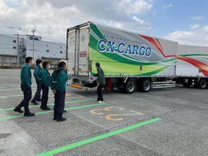 3月13日(土)、今後開始する小野営業所(兵庫県小野市)⇔鳥栖流通センター(佐賀県鳥栖市)間でフルトレーラのスイッチ運行に向けて、鳥栖流通センター輸送課で乗務員5人を対象にフルトレーラの研修を実施しました。研修では、フルトレーラの構造、危険性を理解してもらうために資料や動画を用いた座学と、実車を用いた実地研修を行いました。
