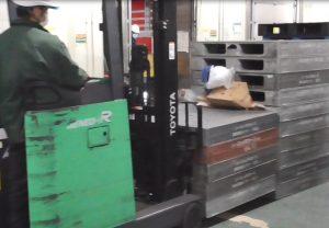 講習では、普段からフォークリフトに慣れてしまってることで、危険なものに接近している認識が希薄になることがないように、フォークリフトの重量や死角についての説明を行い、実際に古くなった安全靴をフォークリフトで踏ませたり、爪の威力を知ってもらうために空段ボールを爪で刺し貫通した様子を見てもらうなど、人との距離を確保しながら実演して見せることで、改めて危険であるということを認識を持ってもらうようにしました。