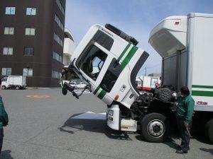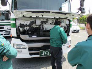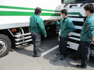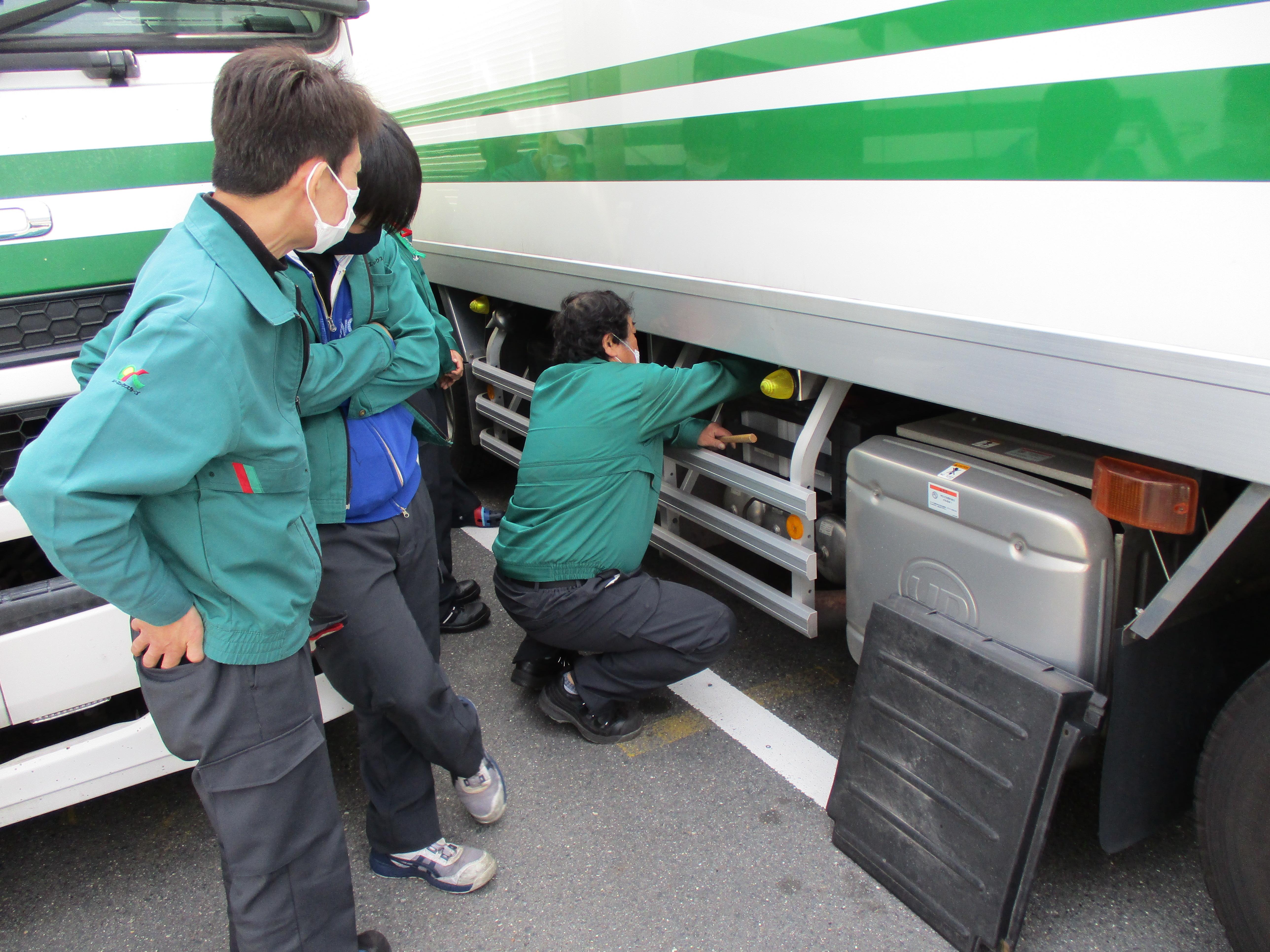 神戸営業所では毎月1回の乗務員ミーティングで、運輸マネジメント会議や営業所からの連絡、国土交通省12項目の指導などを含めた、安全に関する情報の共有・指導を行っています。この営業所では、中堅からベテランの乗務員が多く在籍しています。そのことから惰性で日常点検をすることがないように、4月15日(木)の乗務員ミーティングでは、「車両日常点検の手順について」の「再確認」をしてもらい、今後の安全な運行につなげていくための研修を行いました。