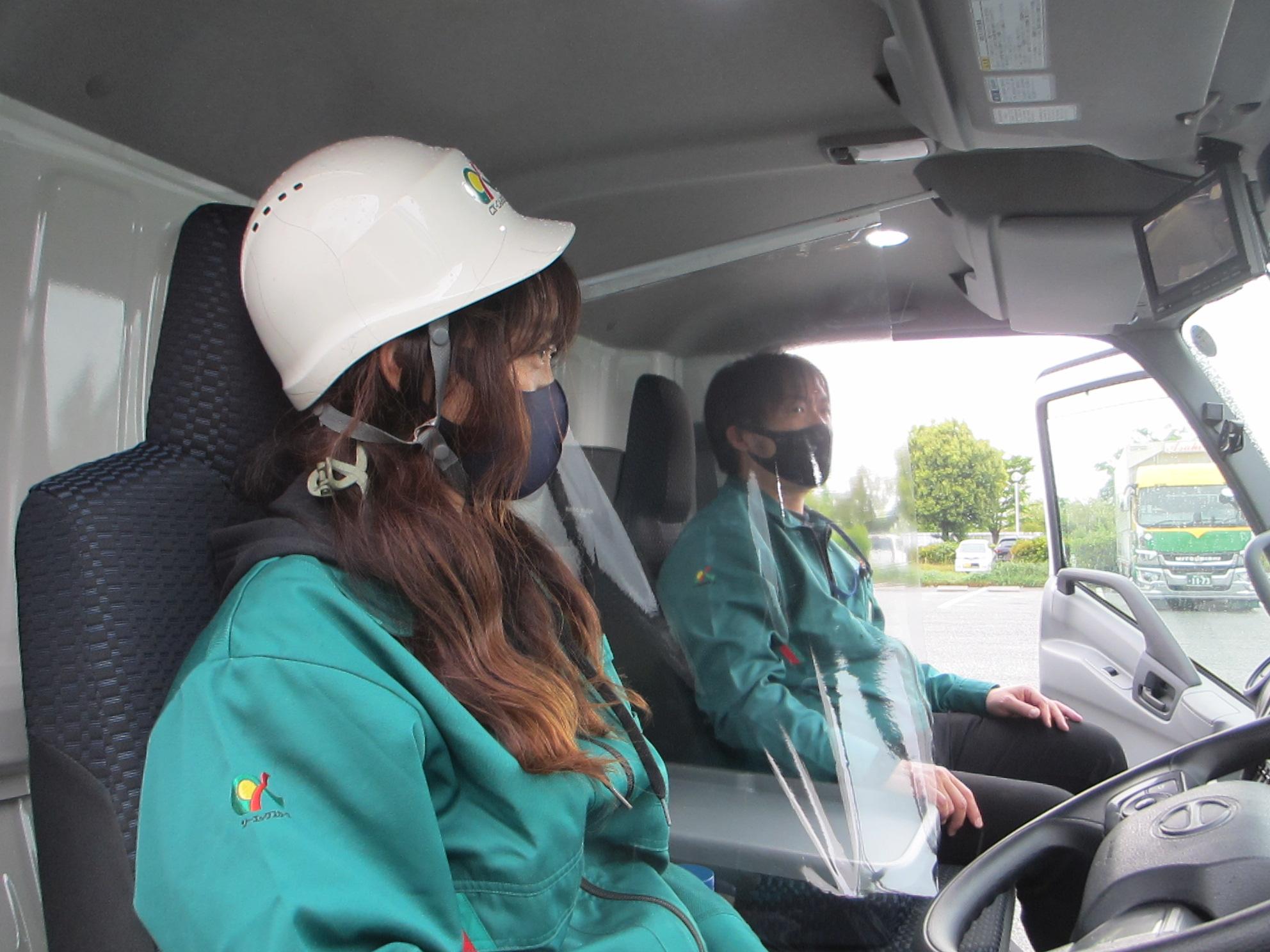 小野営業所輸送課では、兵庫県に発令された緊急事態宣言下での添乗指導を中止していました。しかし、新型コロナウィルス感染拡大により、5月12日(水)に緊急事態宣言が31日(月)まで延長するという発表を受け、新人乗務員の添乗教育の継続ができるよう、感染症予防対策を行いました。添乗教育時の感染防止として、2t車と中型車の運転席と助手席の間にビニールカーテンを設置し、マスクを必ず着用して、窓を全開にして換気を行いながら新人乗務員の育成を行うようにしました。もちろん、換気が必要となるため、雨天時の添乗は中止としています。