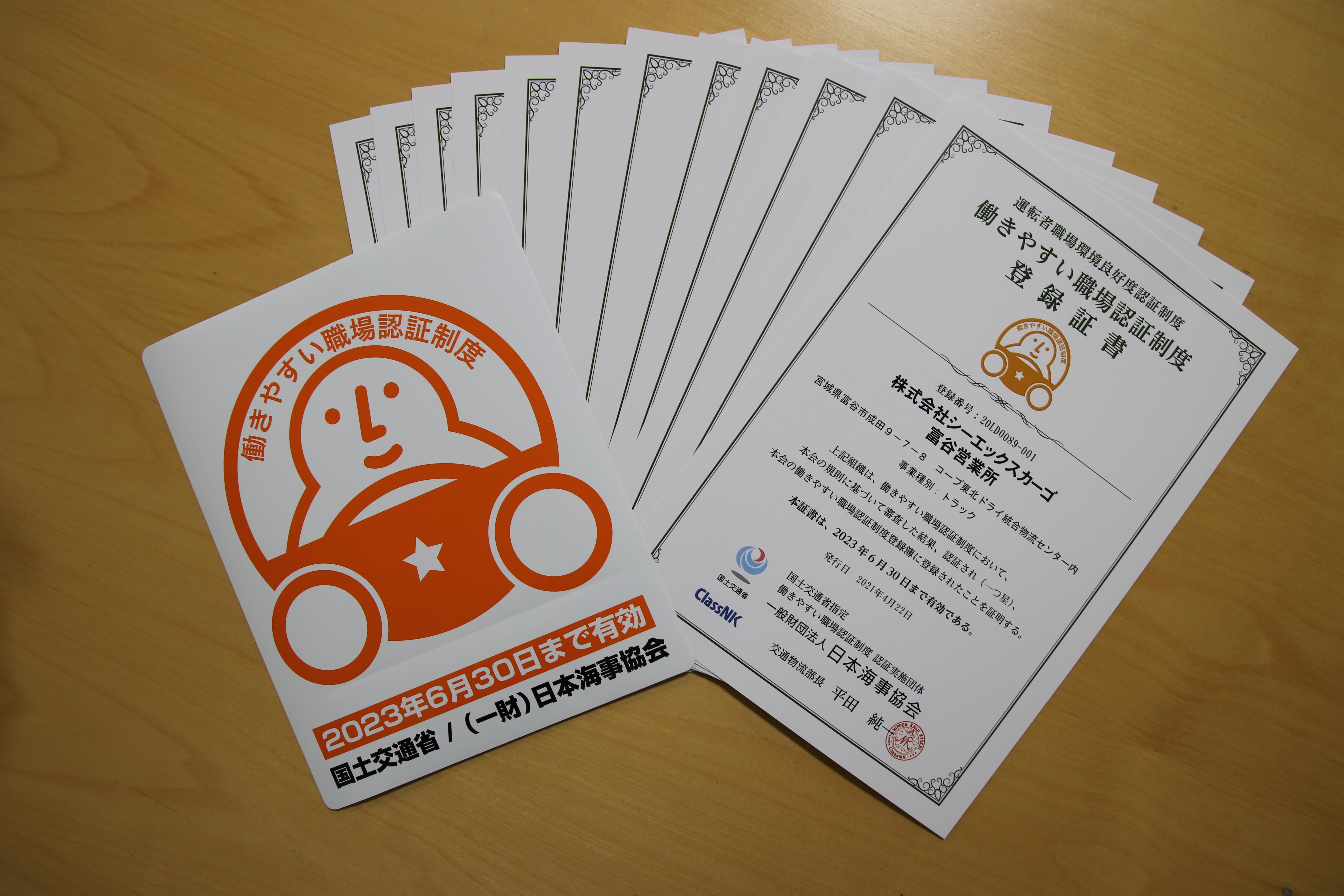 運転者職場環境良好度認証制度「働きやすい職場認証制度」の一つ星の認証を、当社の12事業所で取得しました。