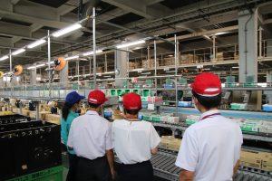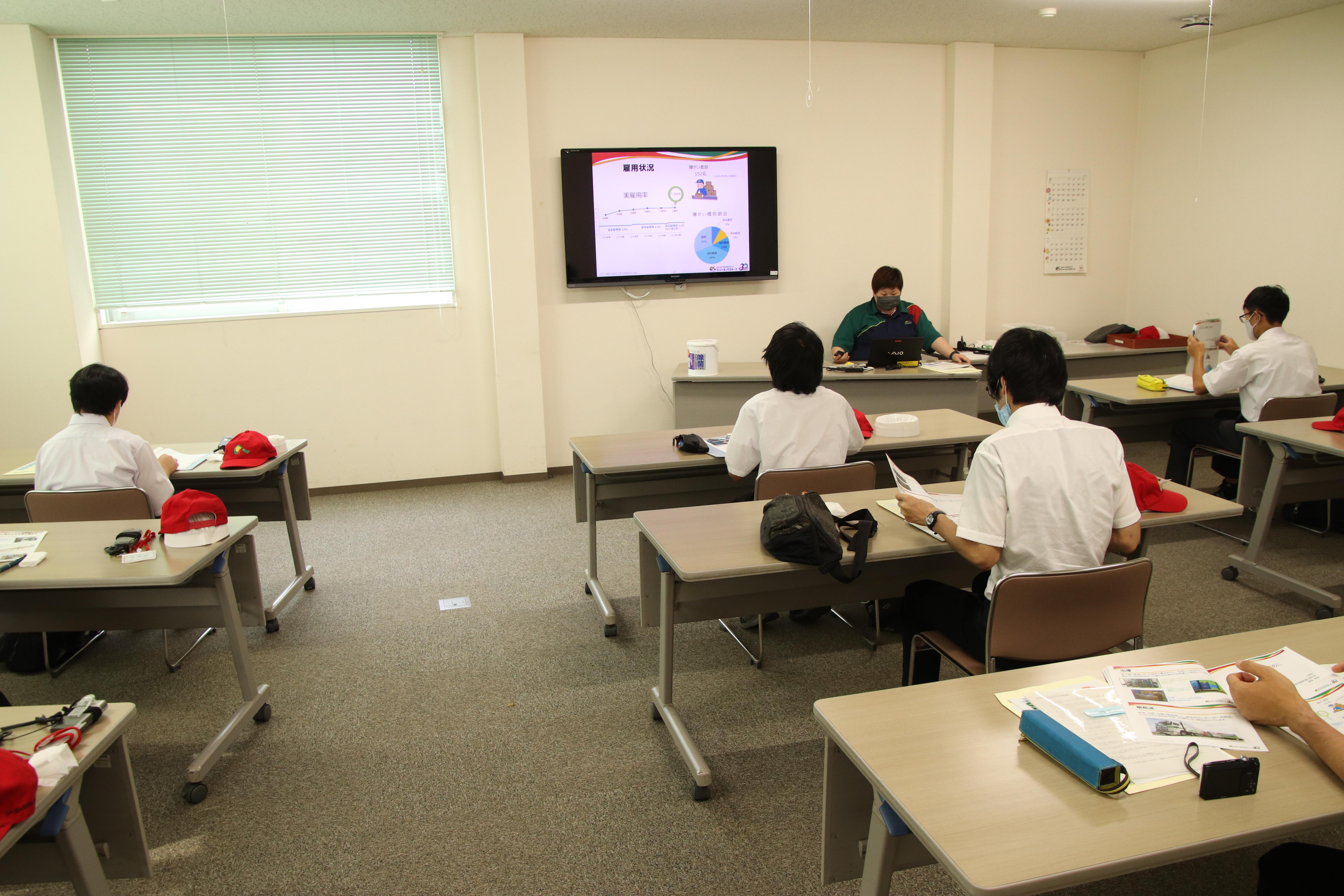 | 職場見学では学校の卒業生が働いている姿や、障がいのある社員が多く在籍する部署を回り、どのような仕事をしているのか知ってもらいました。講演では会社概要や業務内容の紹介、「卒業までに身に付けてほしいこと」というテーマで、あいさつの大切さや、何を目的に働くのかなどを考えてもらう構成となっています。 参加者からは、「2年生になったら、ぜひ今日見学した部署の実習に入りたいです。」という声が上がりました。 |